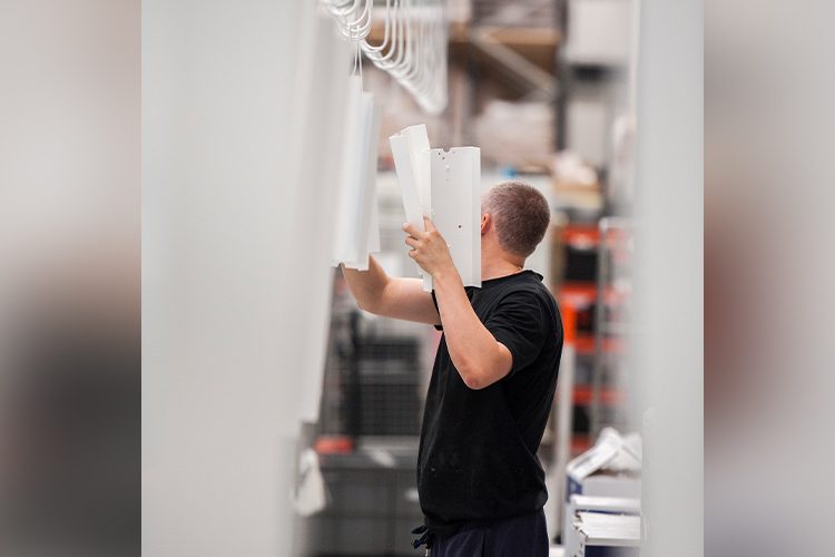 Next comes the polyester powder coat, a freeflowing dry powder that is electrostatically applied to the metal. This is dried and sealed in our drying ovens to provide a tough skin. This finish is incredibly hard to remove, needing a sand blaster or 1500˚C oven to make a mark.