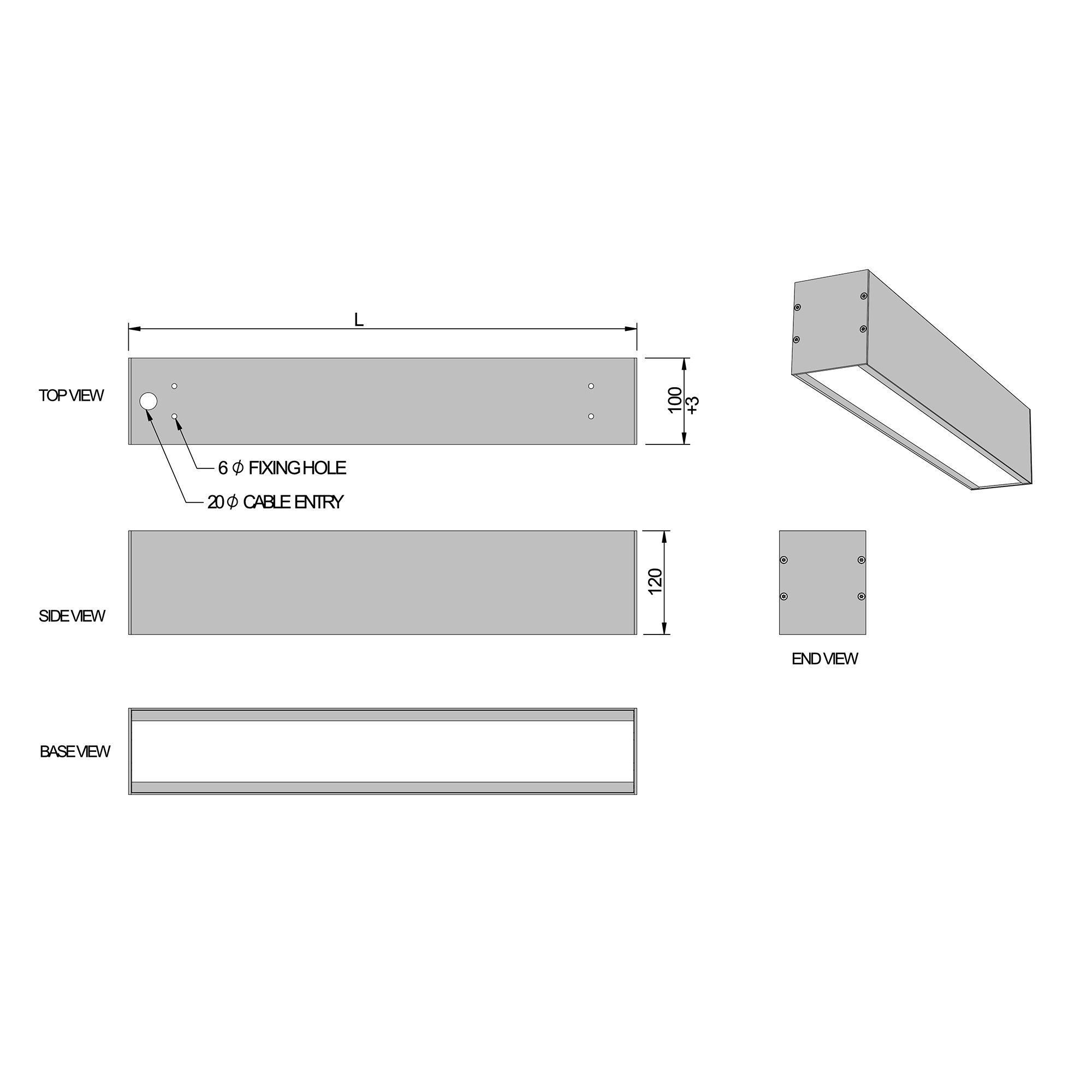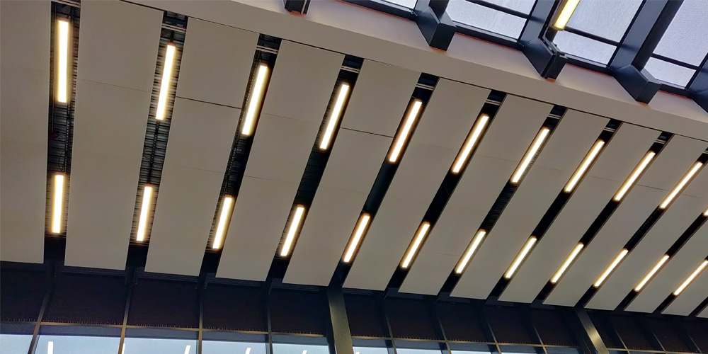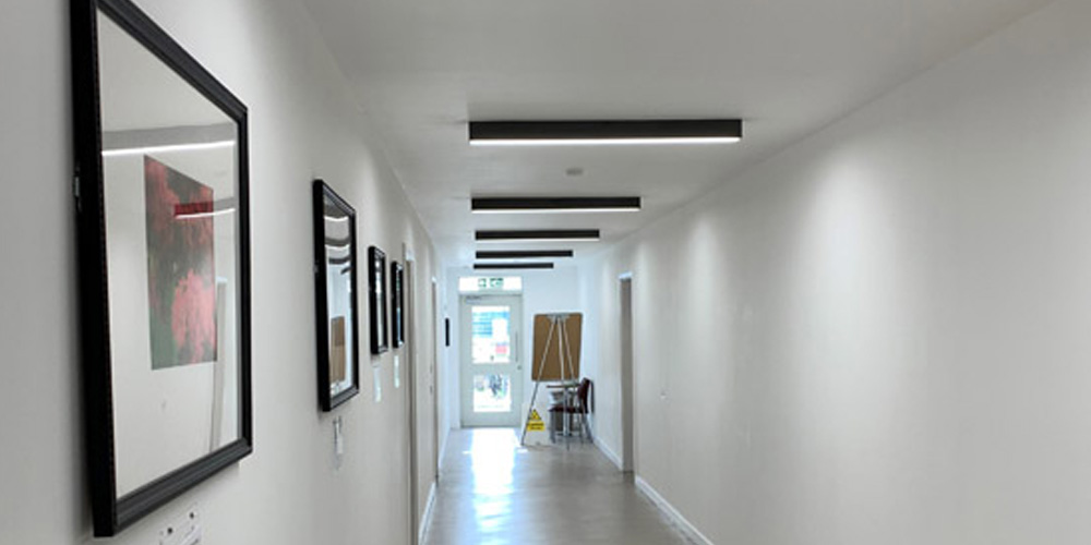 Stromma can be drop rod suspended, surface mounted or used in a recessed style with shadow gap (e.g. for metal plank ceilings). Integral through wire trunking for up to 3 lighting circuits, providing long continuous runs, remote central battery capability and enhanced circuit diversity.