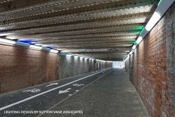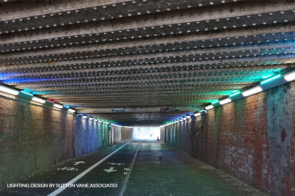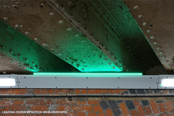 Due to the low height of the underpass, all lighting equipment had to be highly resistant to potential vandalism. The structure also supports an active railway line, imposing specific restrictions on the placement and attachment of lights. To meet these requirements, Sutton Vane Associates collaborated with Designplan. We developed specialised luminaires, including our Tuscan 89 Angled for the white lights and our FlairMicro for coloured lights. Both were designed to withstand the underpass’s environment, with high IP and IK ratings and a special coating to resist graffiti. We also supplied dummy bodies to join the luminaires together and to fix the lighting solution onto the walls.
